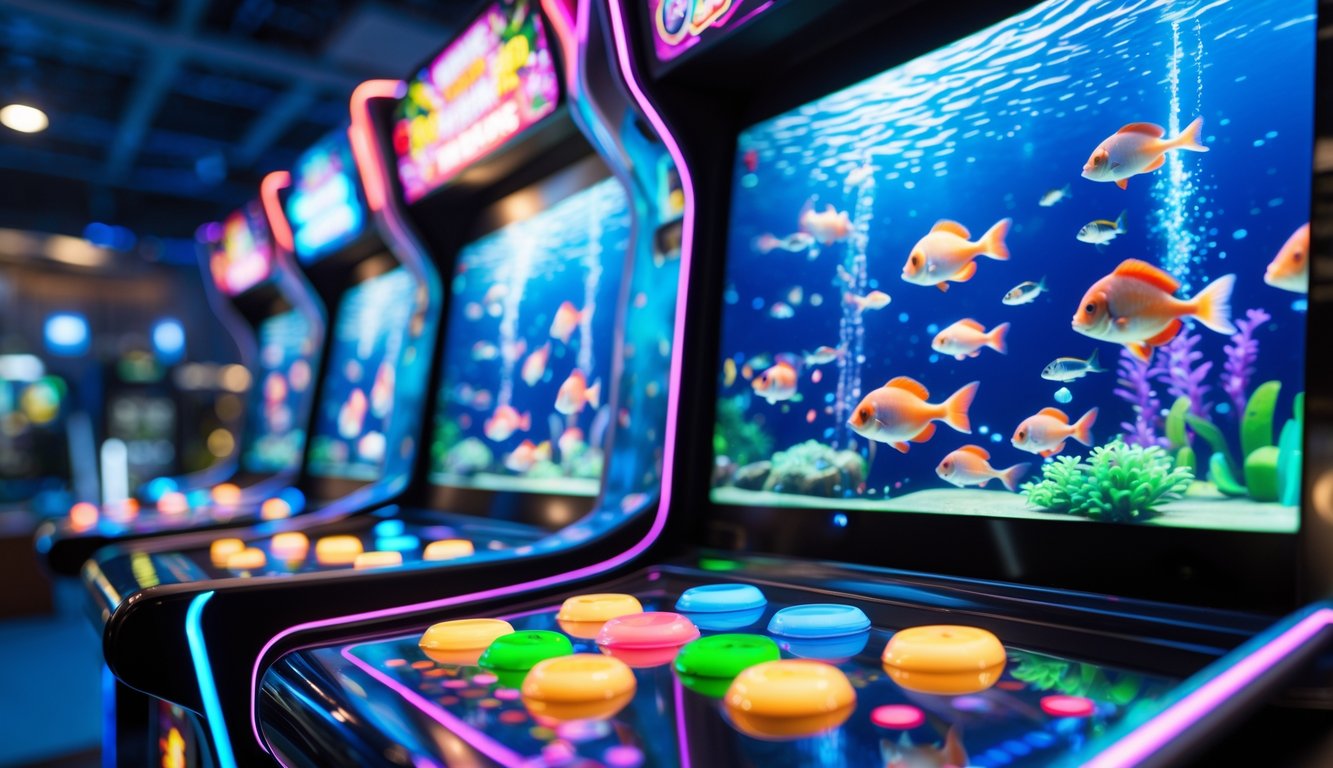 Mesin permainan tembak ikan elektronik dengan layar berwarna cerah dan tombol menyala di dalam ruangan permainan.