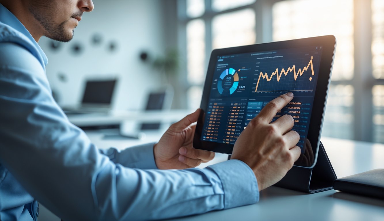Seseorang sedang menganalisis pola pada layar tablet di ruang kantor modern dengan pencahayaan alami.