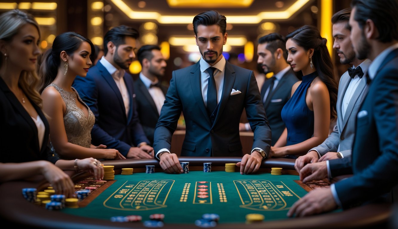 Seorang dealer berdiri di belakang meja baccarat dengan kartu dan chip, dikelilingi oleh pemain yang mengenakan pakaian elegan di dalam kasino.
